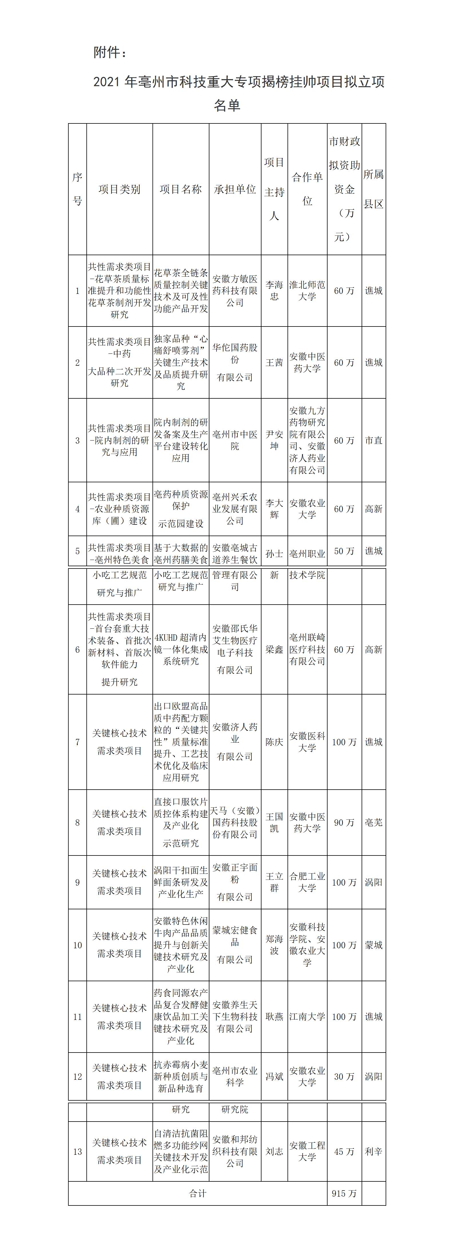 根據(jù)《關于發(fā)布2021年市科技重大專項揭榜掛帥項目張榜清單(申報指南)的通知》(亳科〔2021〕50號),經(jīng)組織申報、專家評審、會議研究等程序,2021年亳州市科技重大專項揭榜掛帥項目擬立項13項(詳見附件),其中共性需求類項目6項,關鍵核心技術需求類項目7項,現(xiàn)予以公示。